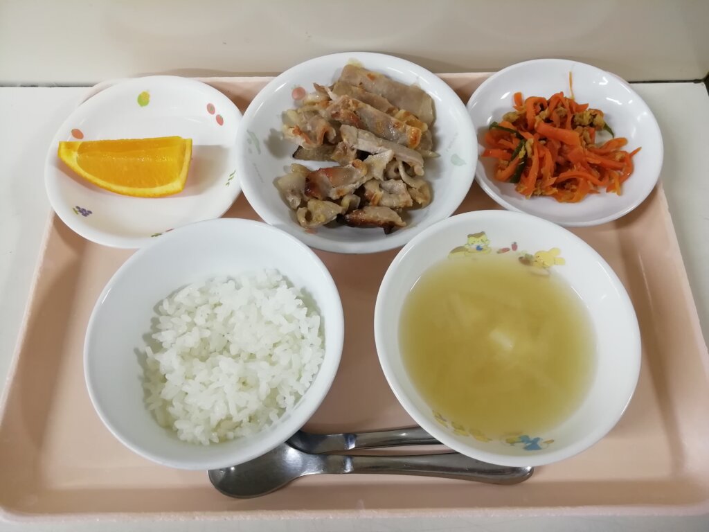 本日(3/30)の給食とおやつ 投稿日 2026-03-30 著者 staff カテゴリー ブログ メニュー:ご飯・みそ汁・豚肉の梅みそ焼き・にんじんしりしり・オレンジ🍊 おやつ:手作りプリン(卵不使)🍮