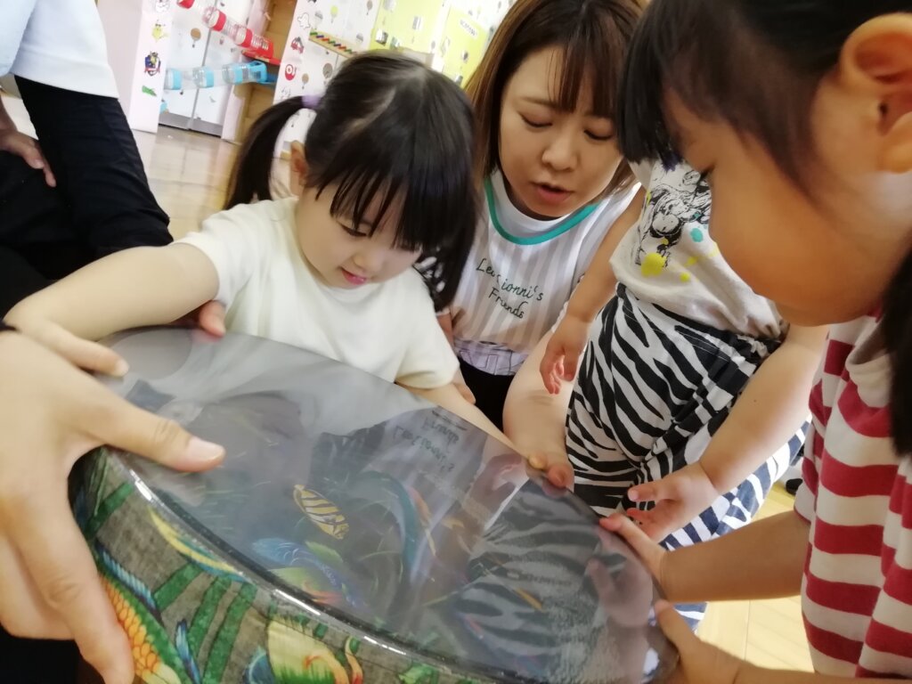 音楽教室での様子🎵オーシャンドラムに興味深々のお友達😊