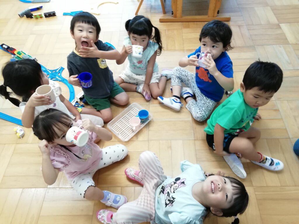 室内で遊んでいても水分補給は欠かせません!持参している水筒も飲みながらも、