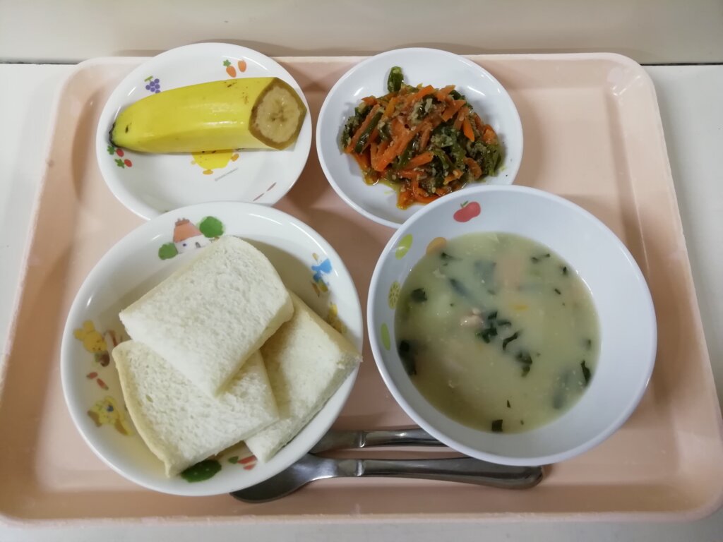 本日(10/1)の給食とおやつ 投稿日 2025-10-01 著者 staff カテゴリー あしび保育園の給食・おやつ メニュー:クリームシチュー・食パン・ピーマンのきんぴら・バナナ🍌 おやつ:牛乳・アメリカンドッグ
