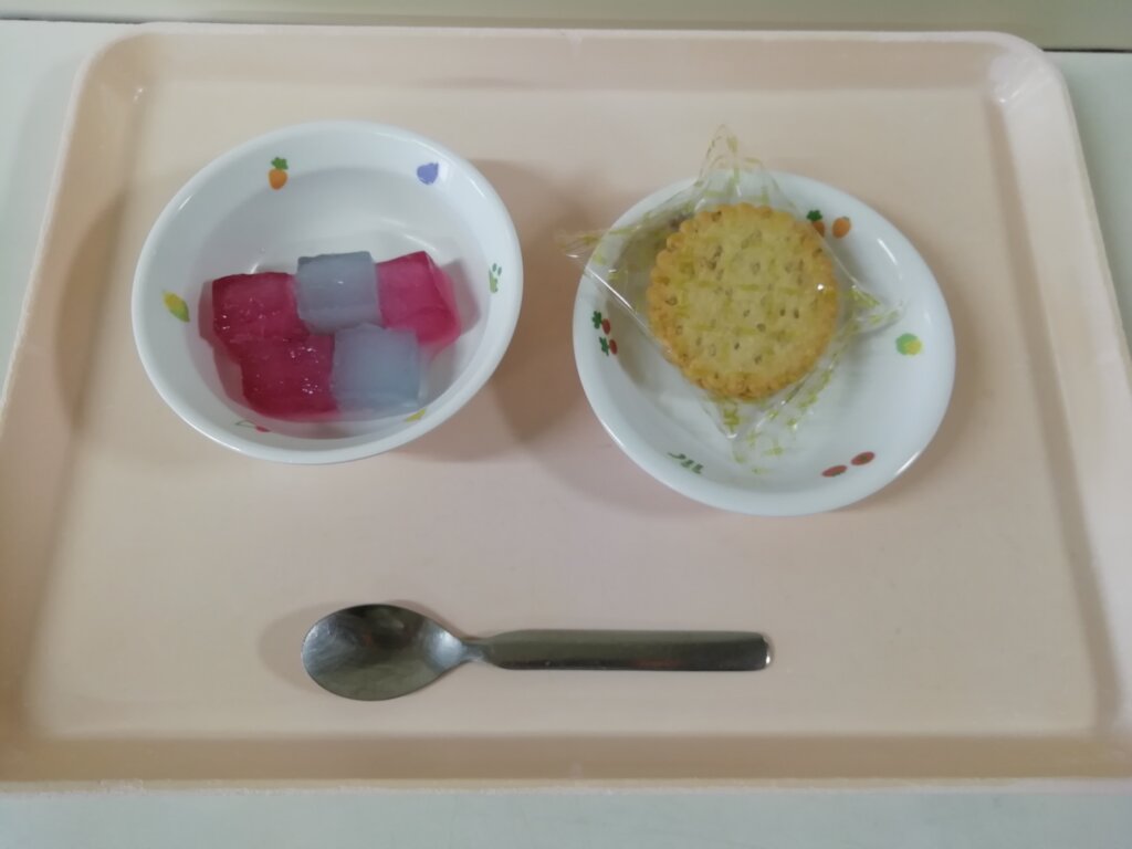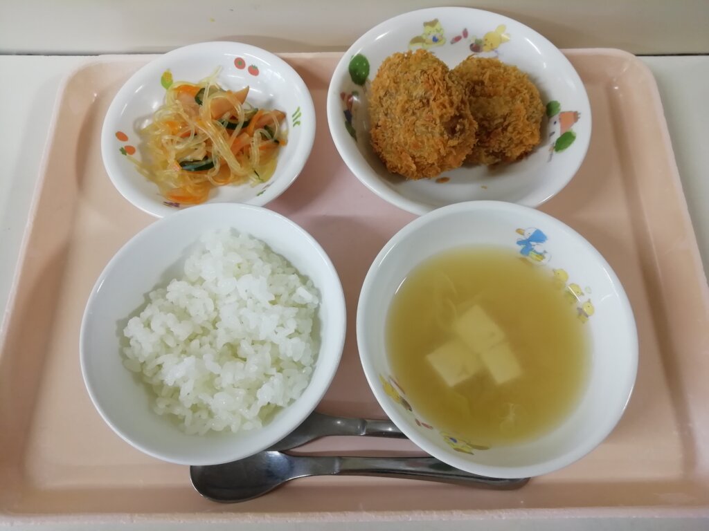 本日(10/2)の給食とおやつ 投稿日 2025-10-02 著者 staff カテゴリー あしび保育園の給食・おやつ メニュー:ご飯・みそ汁・カレーコロッケ・伴三糸 おやつ:2色ゼリー(サイダー&ぶどう🍇)