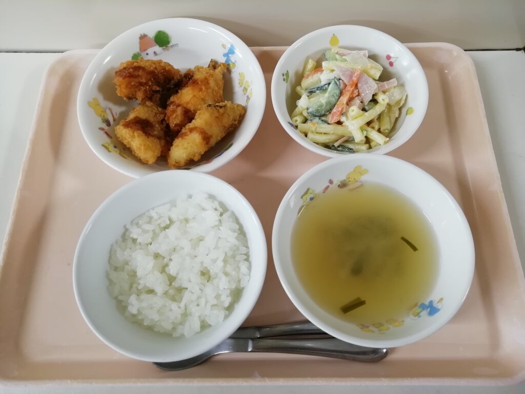 メニュー:ご飯・みそ汁・カレイのフライ・マカロニサラダ