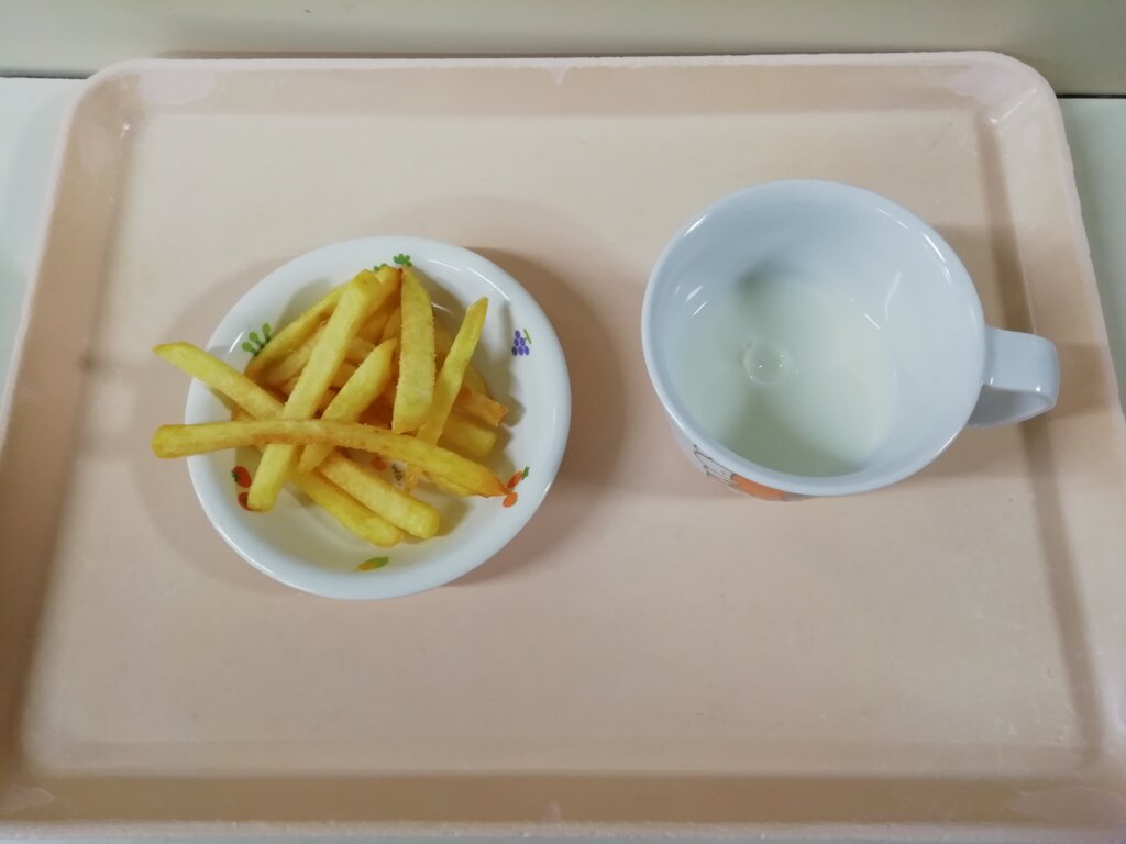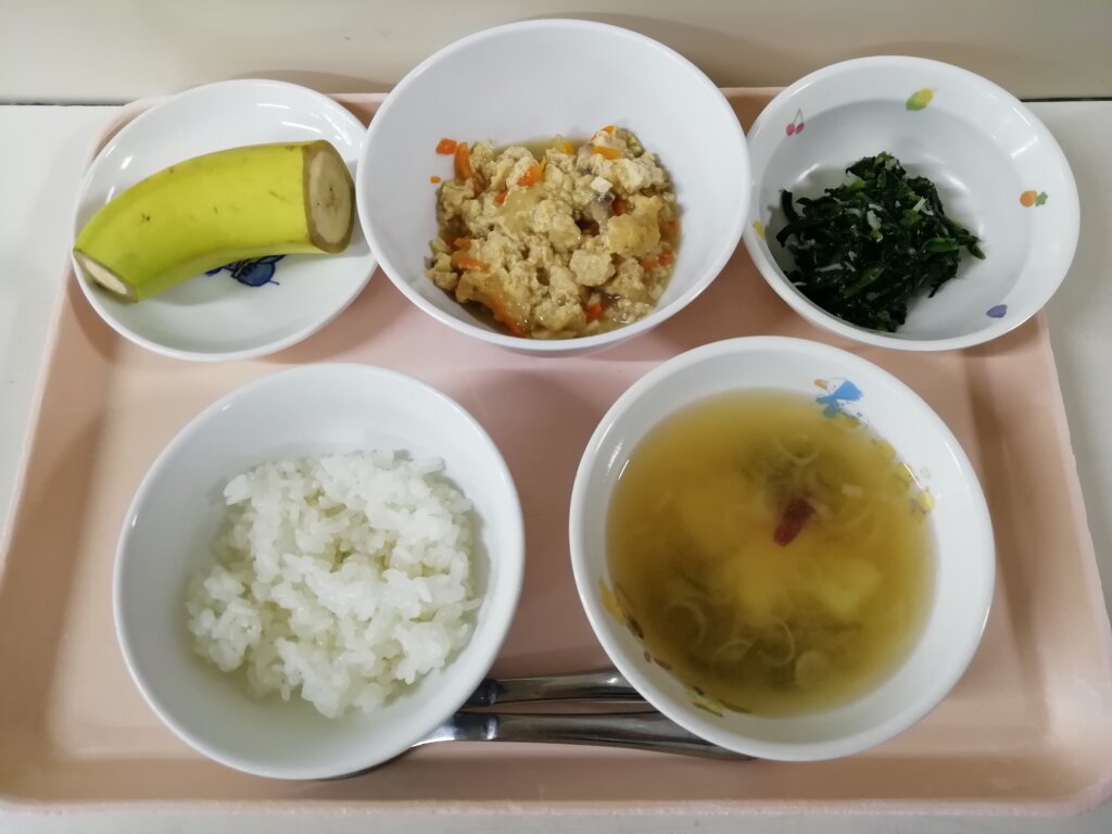 メニュー:ご飯・みそ汁・炒り豆腐・しらす和え・バナナ🍌