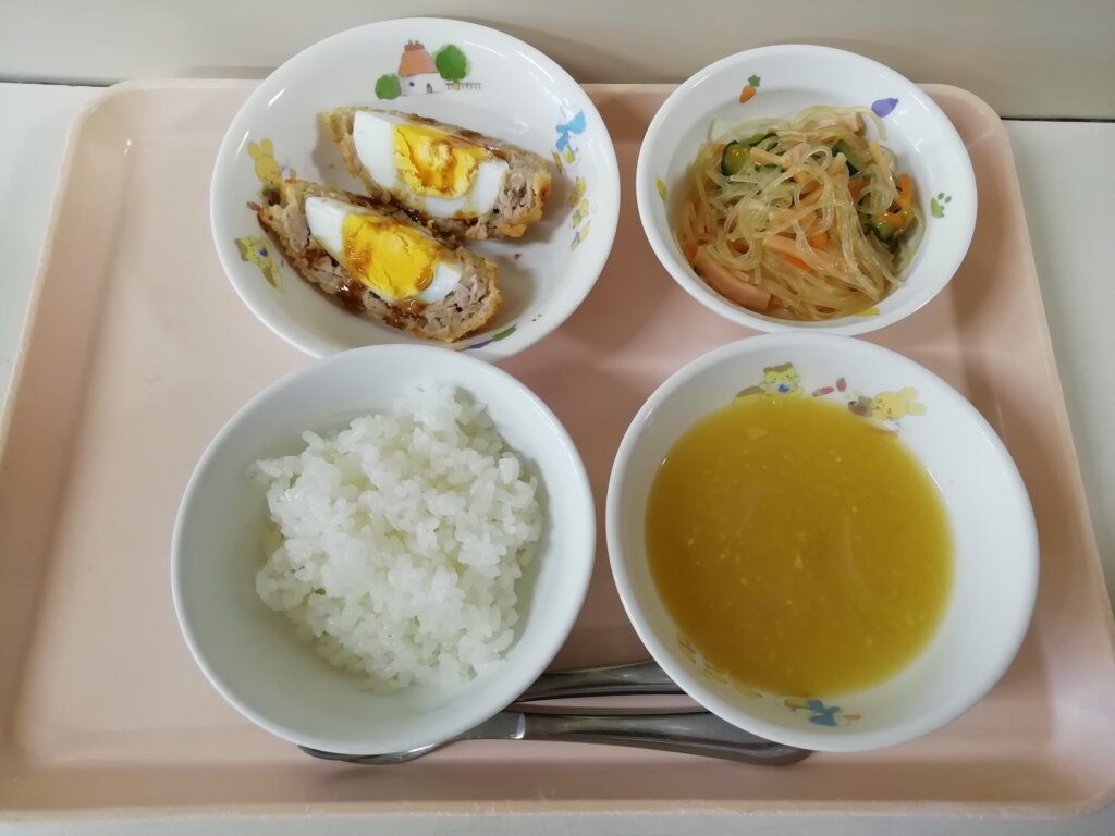 メニュー:ご飯・みそ汁・スコッチエッグ・伴三糸