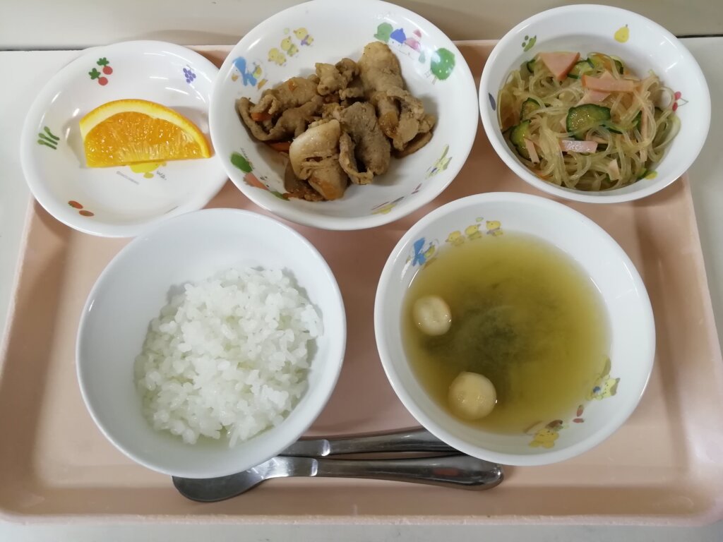 メニュー:ご飯・みそ汁・焼き肉・伴三糸・オレンジ🍊