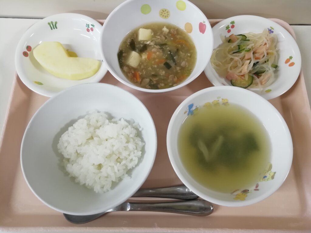メニュー:ご飯・みそ汁・麻婆豆腐・春雨サラダ・リンゴ🍎