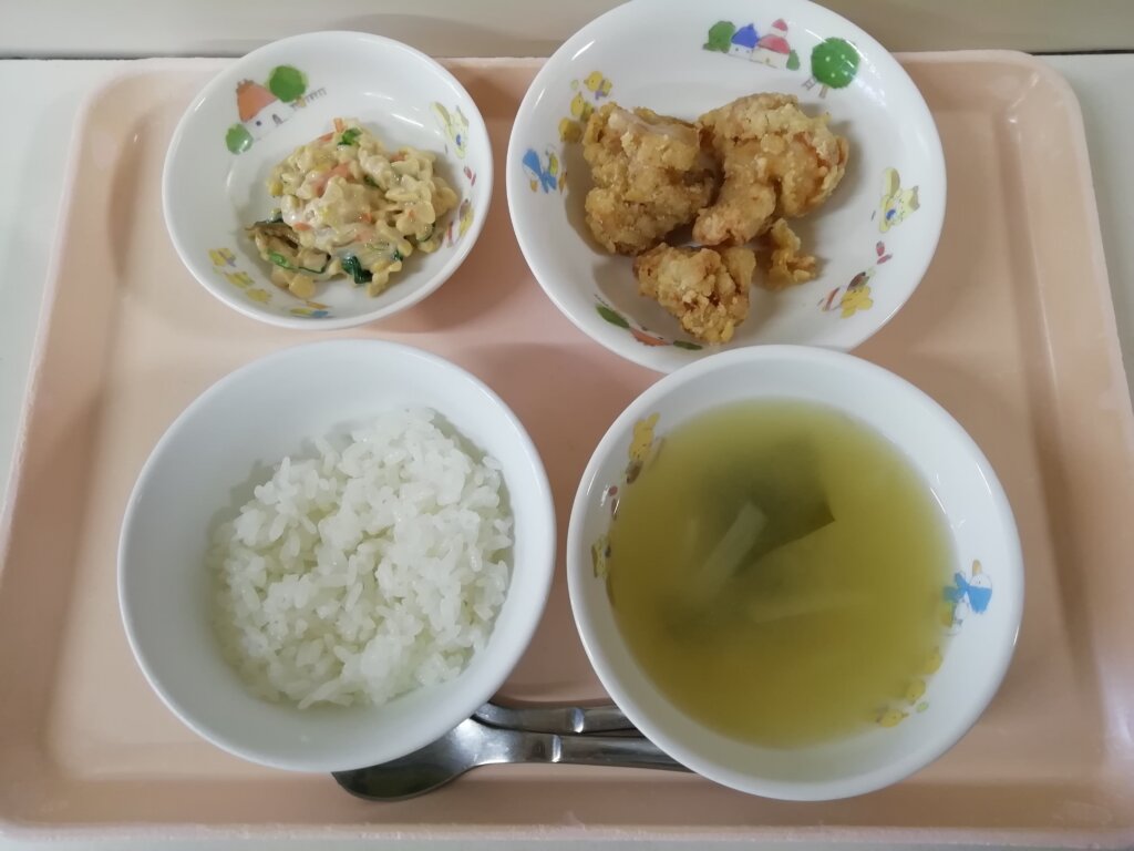 メニュー:ご飯・みそ汁・ひとしお唐揚げ・納豆和え