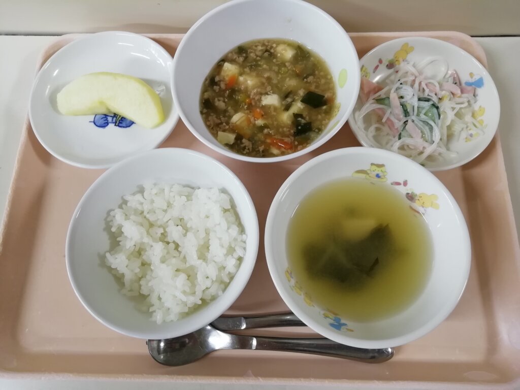 本日(1/23)の給食とおやつ 投稿日 2026-01-23 著者 staff カテゴリー あしび保育園の給食・おやつ メニュー:ご飯・みそ汁・麻婆豆腐・春雨サラダ・リンゴ🍎 おやつ:もちもちチーズパン・牛乳