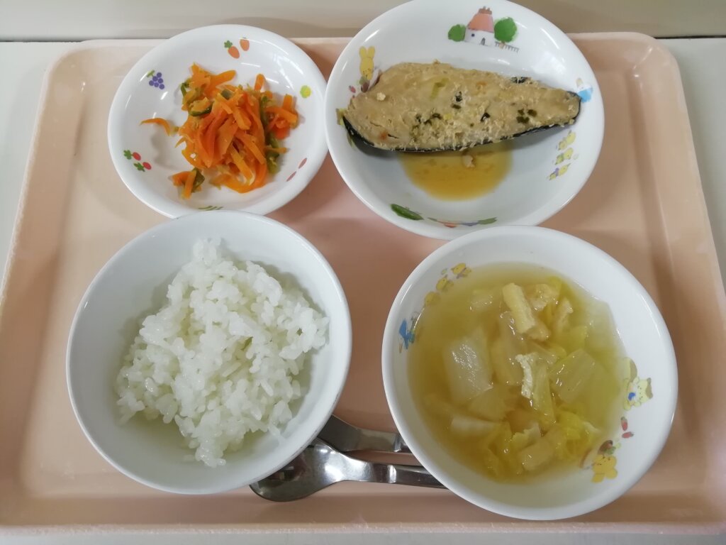 メニュー:ご飯・みそ汁・サバの香味焼き・にんじんしりしり🥕