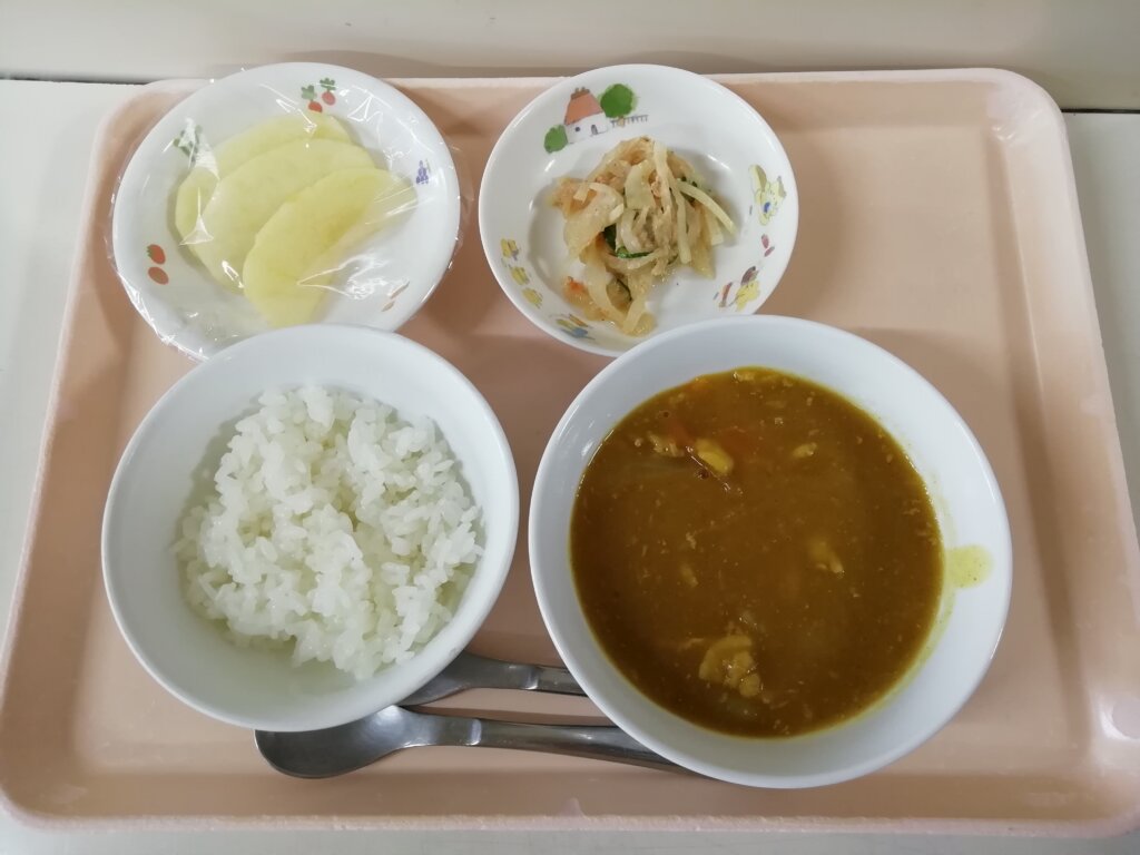 メニュー:ボークカレーライス🍛・大根サラダ・リンゴ