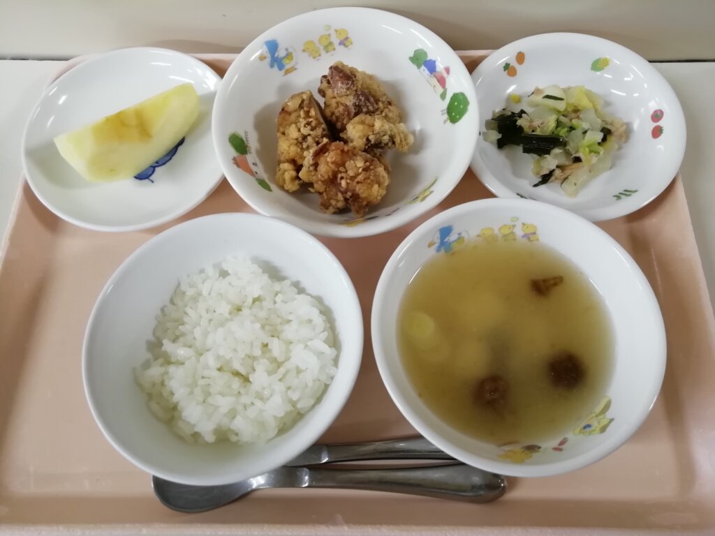 本日(2/18)の給食とおやつ 投稿日 2026-02-18 著者 staff カテゴリー あしび保育園の給食・おやつ メニュー:ご飯・みそ汁・鶏肉の唐揚げ・白菜とツナのサラダ・りんご🍎 おやつ:バナナヨーグルト