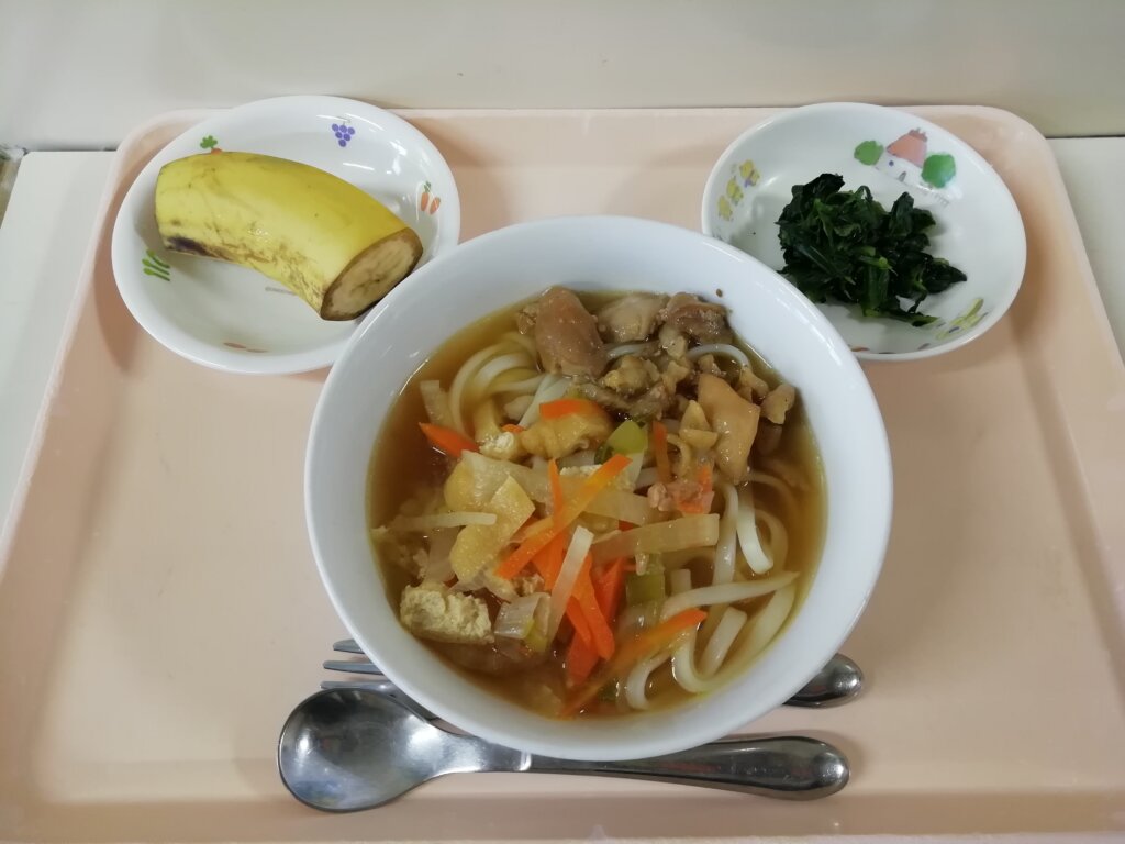 メニュー:けんちんうどん・小松菜の磯和え・バナナ🍌