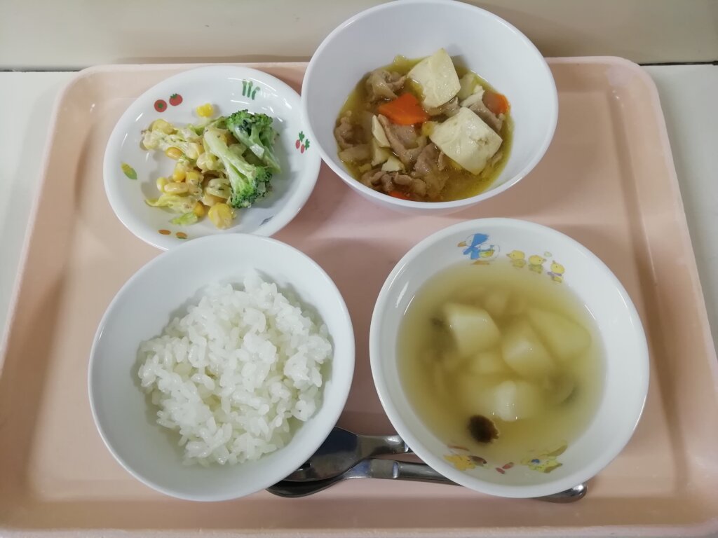 本日(2/24)の給食とおやつ 投稿日 2026-02-24 著者 staff カテゴリー あしび保育園の給食・おやつ メニュー:ご飯・みそ汁・肉豆腐・野菜のごまマヨネーズ和え おやつ:おせんべい・アンパンマンジュース(りんご味)