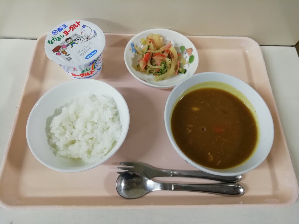 本日(2/26)の給食とおやつ 投稿日 2026-02-26 著者 staff カテゴリー あしび保育園の給食・おやつ メニュー:チキンカレーライス・大根サラダ・ヨーグルト おやつ:牛乳・玄米フレーク菓子