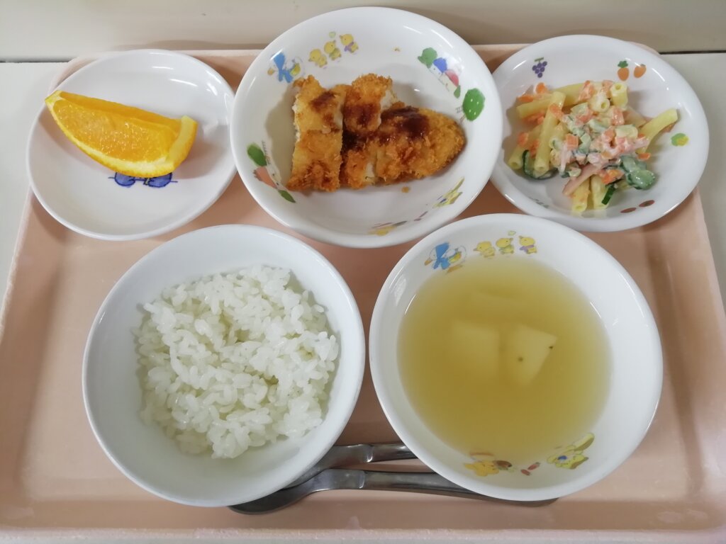 本日(3/4)の給食とおやつ 投稿日 2026-03-04 著者 staff カテゴリー あしび保育園の給食・おやつ メニュー:ご飯・みそ汁・ささみフライ・マカロニサラダ・オレンジ🍊 おやつ:牛乳・メープルラスク🍁