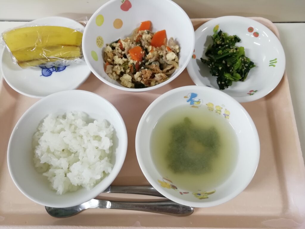 本日(3/6)の給食とおやつ 投稿日 2026-03-06 著者 staff カテゴリー あしび保育園の給食・おやつ メニュー:ご飯・みそ汁・豆腐チャンプルー・小松菜のごま和え・バナナ おやつ:牛乳・いちごジャムのマフィン🧁