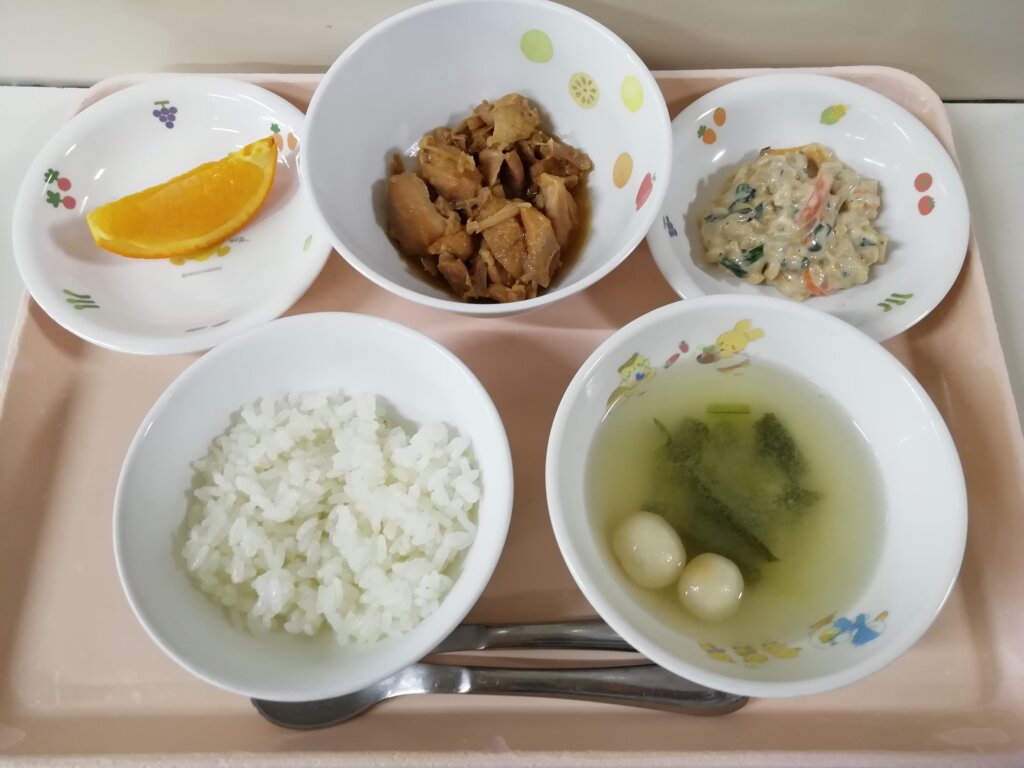本日(3/23)の給食とおやつ 投稿日 2026-03-23 著者 staff カテゴリー あしび保育園の給食・おやつ メニュー:ご飯・みそ汁・鶏肉の酢じょうゆ煮・納豆和え・オレンジ🍊 おやつ:牛乳・ウインナードッグ🌭