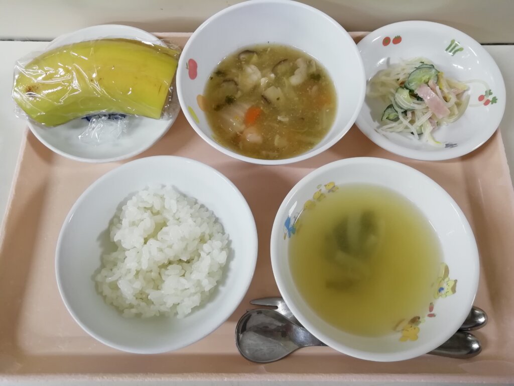 本日(3/27)の給食とおやつ 投稿日 2026-03-27 著者 staff カテゴリー あしび保育園の給食・おやつ メニュー:ご飯・みそ汁・八宝菜・春雨サラダ・バナナ🍌 おやつ:牛乳・コッペパン(ジャム&マーガリン)