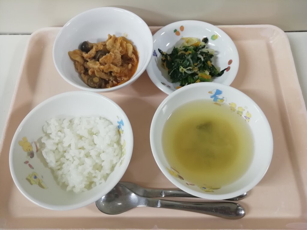 メニュー:ご飯・みそ汁・ポークチャップ・もやしとほうれん草のナムル