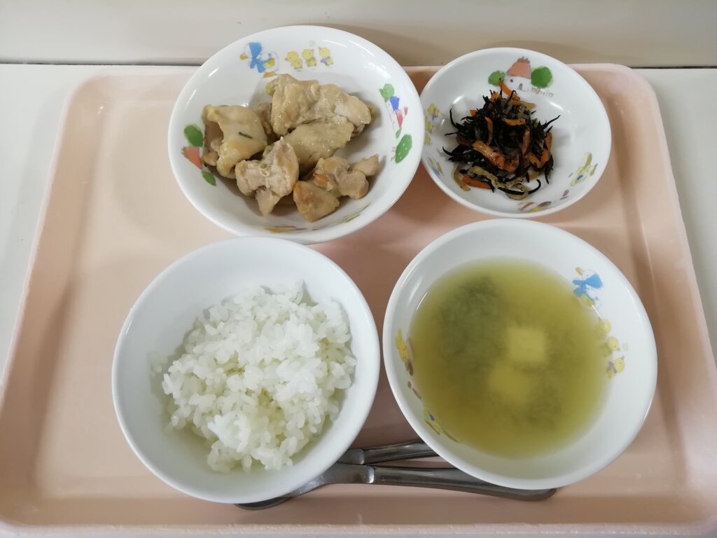 メニュー:ご飯・みそ汁・鶏肉のねぎみそ焼き・ひじき炒め