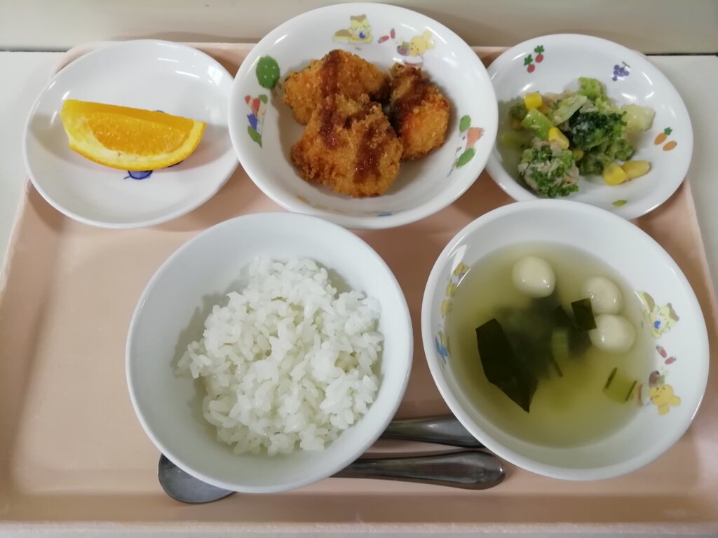 メニュー:ご飯・みそ汁・鮭フライ・ブロッコリーとコーンのサラダ・オレンジ