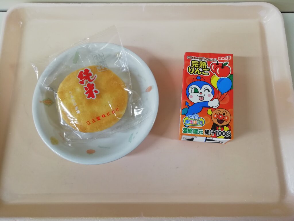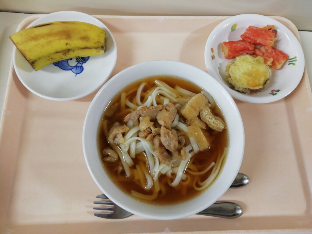 本日(4/24)の給食とおやつ 投稿日 2026-04-24 著者 staff カテゴリー あしび保育園の給食・おやつ メニュー:うどん・天ぷら(さつまいも、カニカマ)・バナナ🍌 おやつ:お菓子・りんごジュース🧃