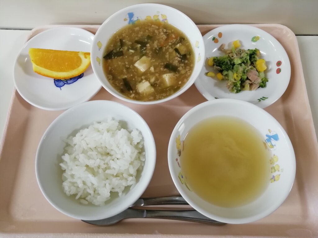 本日(4/21)の給食とおやつ 投稿日 2025-04-21 著者 staff カテゴリー あしび保育園の給食・おやつ メニュー:ご飯・みそ汁・麻婆豆腐・ブロコッリーとコーンのサラダ・オレンジ おやつ:牛乳・豆乳ホットケーキ